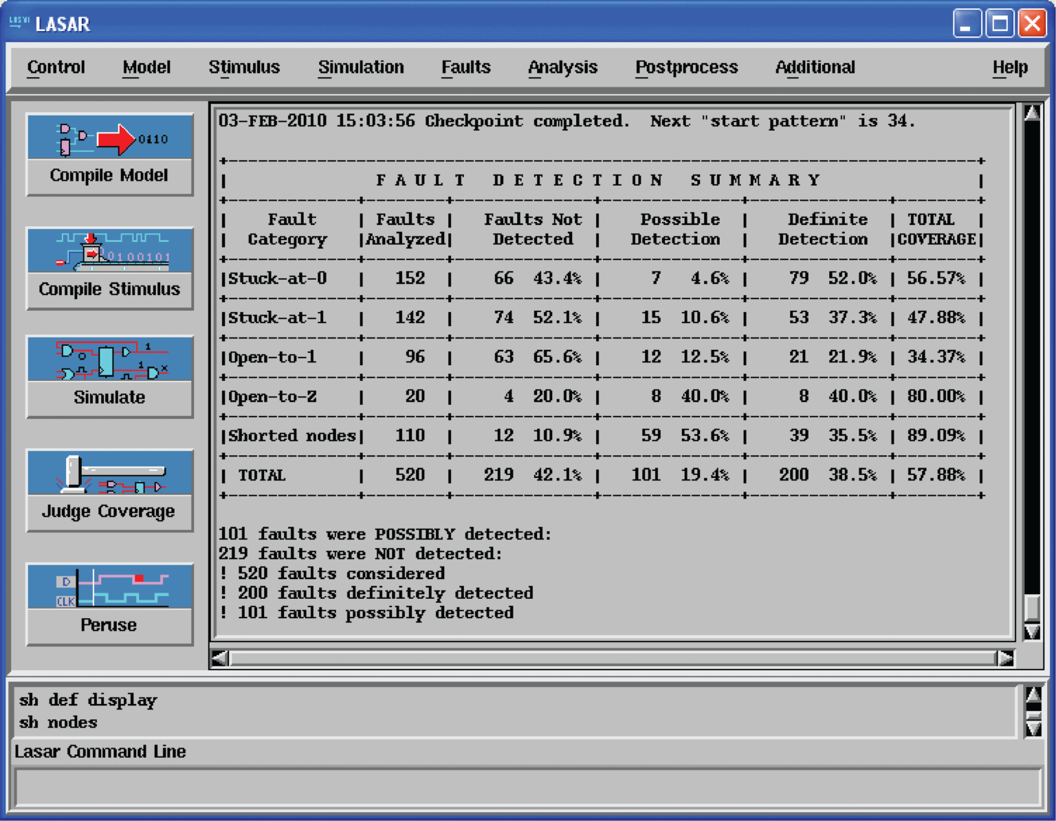 - LASAR软件是一款仿真模拟软件,主要用数字电路测试中,可对真实的数字电路板进行建模仿真,预测电路中真实的信号实现,同时还可以对电路中施加故障情况进行仿真,仿真后的结果可以导出为IEEE1445标准格式,从而可以用后续真实电路板的测试及故障定位隔离。